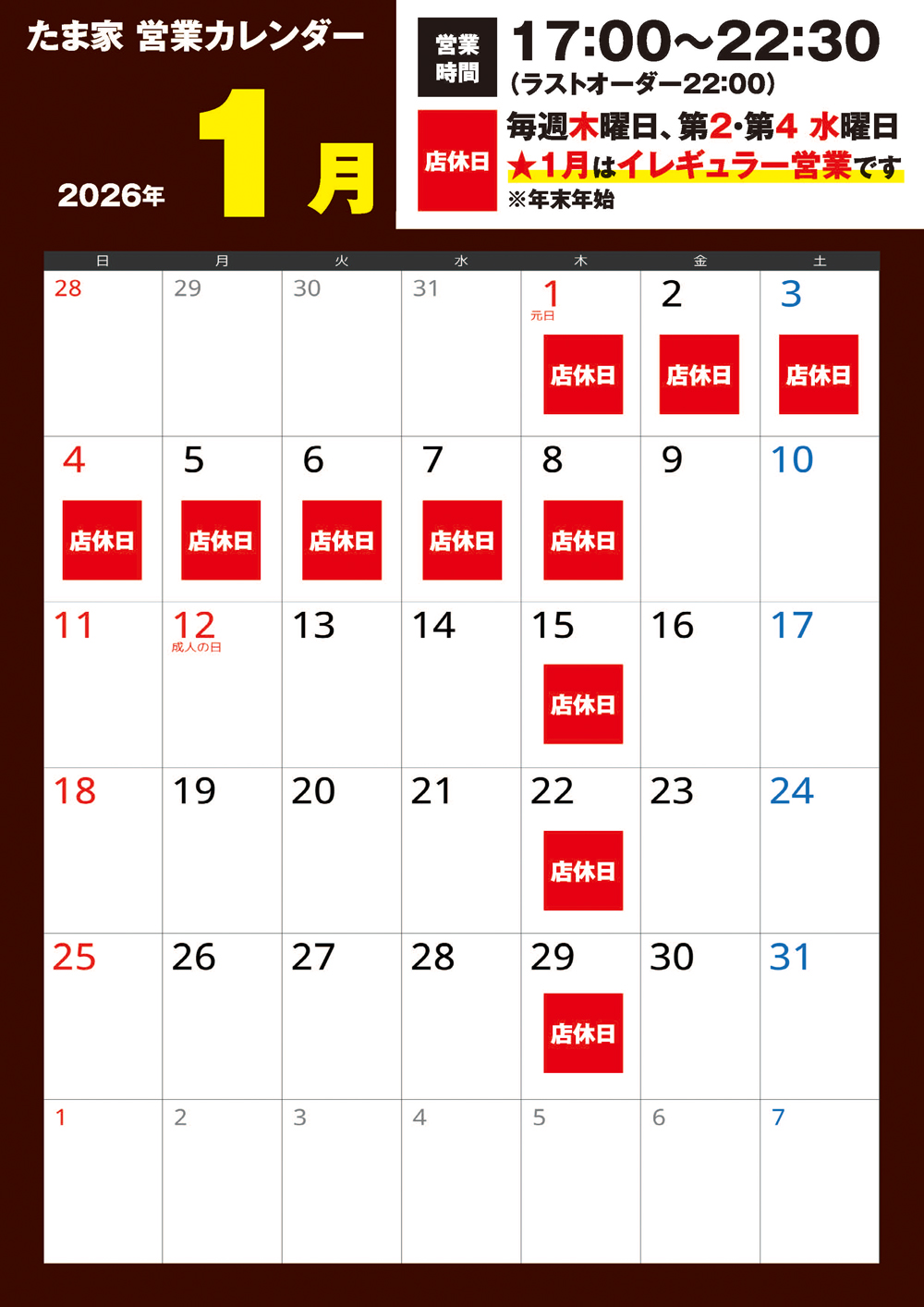 2026年1月の営業カレンダーをアップしました【1月9日~営業開始】